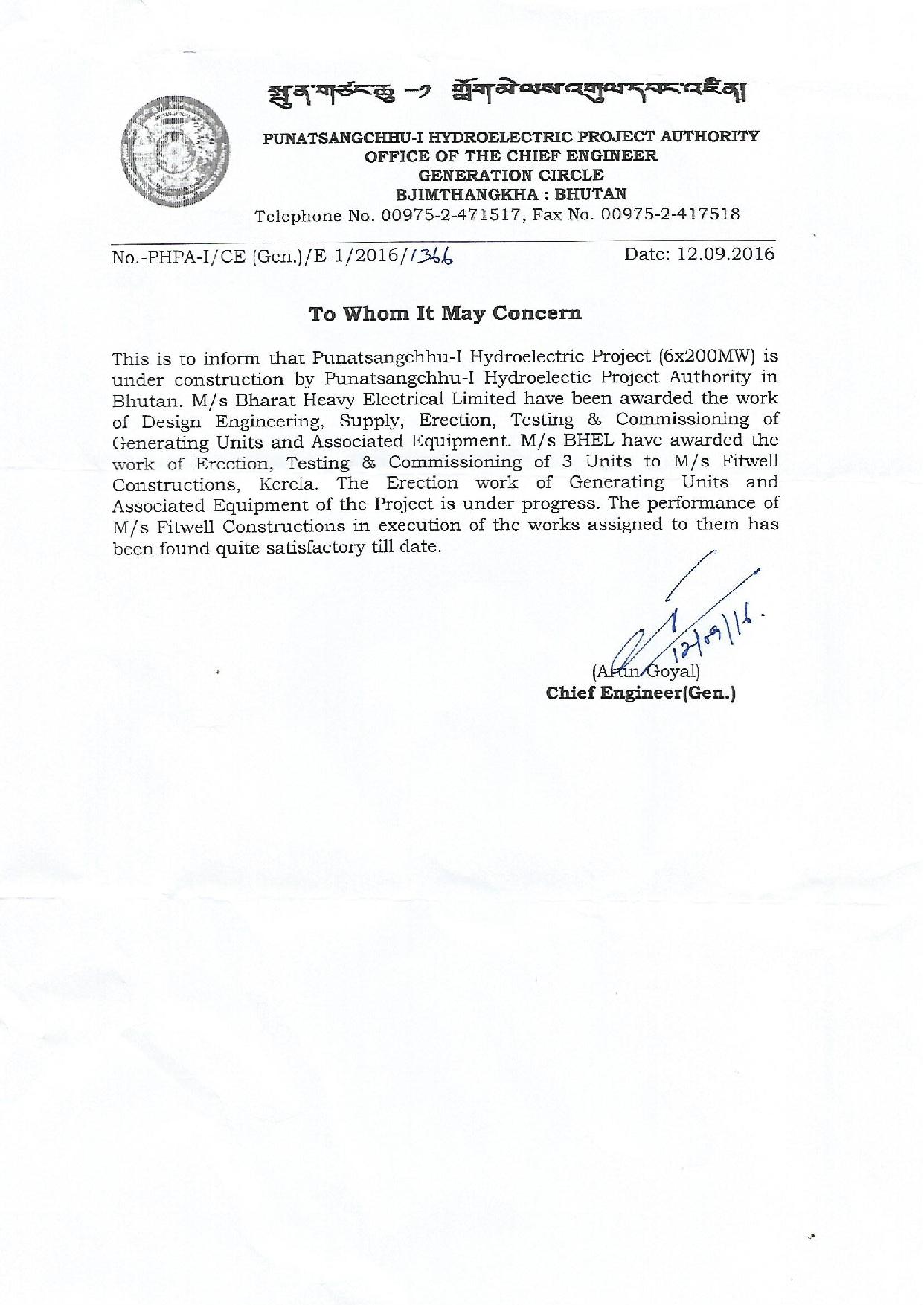 Fitwell Construction gratefully acknowledges the Performance Certificate issued by Shri Arun Goyal, Chief Engineer (Generation), Punatsangchhu-1 Hydroelectric Project Authority (PHPA-1), Bhutan for the satisfactory execution of the work at 6X200MW Punatsangchhu-1 Hydro Electric Project. We are thankful to our customer M/s Bharat Heavy Electricals Ltd- Power Sector Eastern Region, Kolkata for their continued support, and our valued employees for the unceasing effort which helped us achieve this honour.